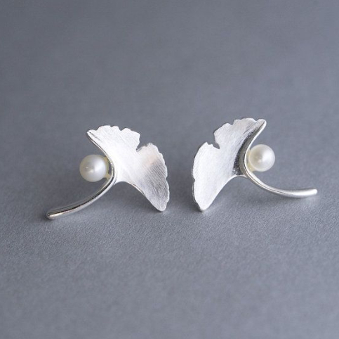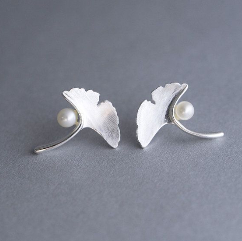 Womens Leaf Ginkgo Pearl Minimalist Earrings