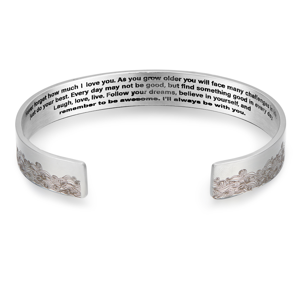 Add sparkle to your collection today! This beautiful Engraved Inspiration Message Waves Cuff Bangle this product makes the perfect gift or personal indulgence. Order now with secure packaging and fast shipping!