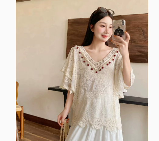 Womens Fashion Embroidered Hollow Lace Short-Sleeve Shirt. Premium quality, free shipping.